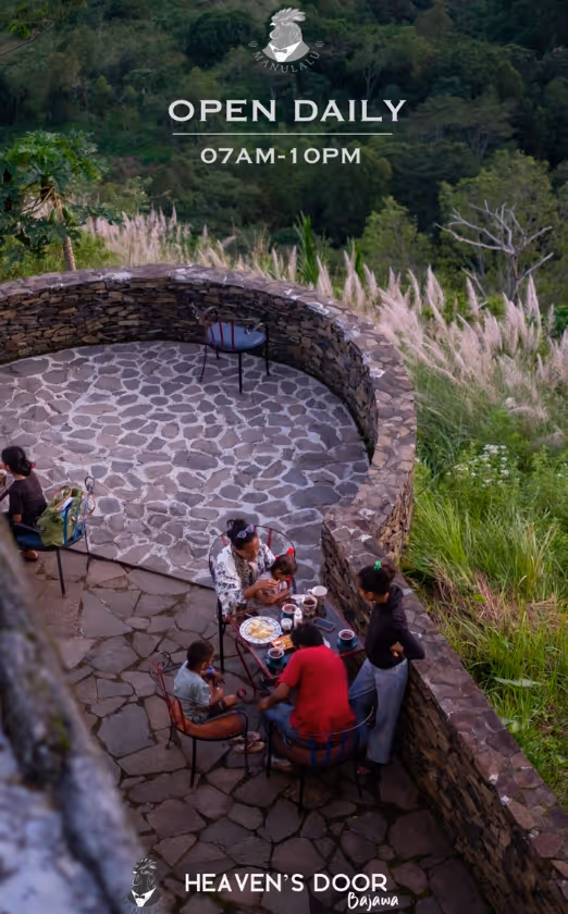 Perched above Bajawa, Heaven’s Door offers a breathtaking panorama over Mount Inerie, the traditional village of Bena and the distant sea. This spectacular setting is what leaves visitors speechless, and why so many travelers choose to stop, stay, and fully experience the magic of the place.